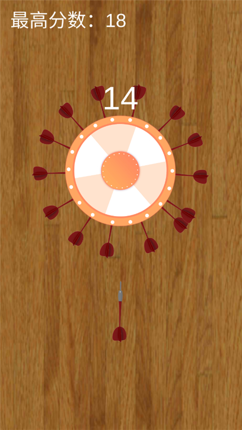 2、随着游戏进行,靶圈会不断旋转并改变速度,你需要精准判断投掷时机,在已有的飞镖之间找到空隙投掷新飞镖。