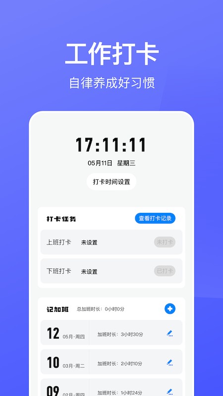 1、内置智能加班计算器,自动识别标准工时外的加班时段,精确到分钟记录加班时长,并支持自定义加班费率设置,一键生成加班工资报表。
