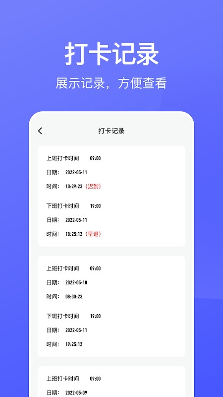 3、支持多种打卡方式包括GPS定位打卡、WiFi打卡等,系统会智能识别打卡地点和时间,自动生成详细的打卡时间轴,方便用户核对每日出勤情况。