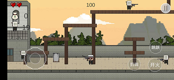 3、进入游戏后左下角控制方向移动,右侧是可以进行跳跃、开火以及扔钱,左上角是当前的生命值和已获钱袋。游戏采用直观的UI设计,所有关键信息一目了然,让玩家可以专注于战斗本身。