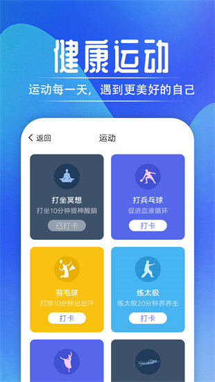 1、丰富的运动项目支持:除了基础计步功能,还支持打坐冥想、乒乓球、太极拳、羽毛球等特色运动项目,一键设置打卡目标。