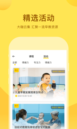 2、活动中心提供丰富的线上或线下早教活动推荐,家长可以根据孩子的兴趣和需求分类浏览,轻松完成活动报名,拓展孩子的社交圈。