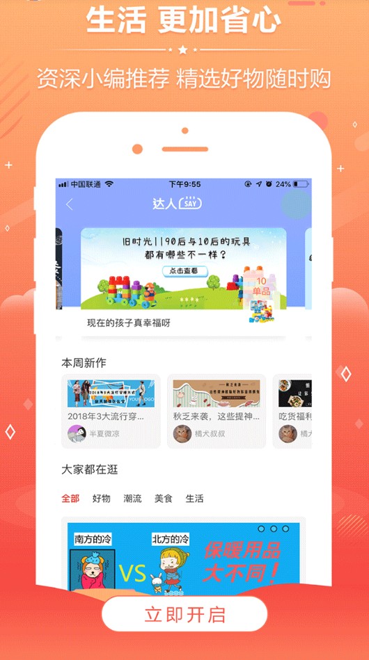 【人工推荐】专业买手团队每日精选100+高性价比商品,从9.9元包邮到奢侈品都有涵盖。还会根据季节和热点事件推出专题推荐,如"开学季""年货节"等特辑。