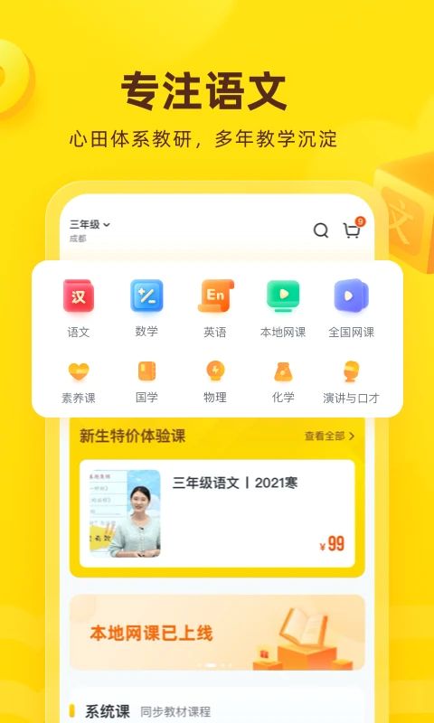 心田花开网校专注于K12全学科教育,以"情商语文"为特色课程体系,同时全面覆盖小学到初中的数学、英语等核心学科,以及人文、历史、艺术等素质类课程。平台采用"名师直播+专属辅导"的双师教学模式,由经验丰富的名校教师负责直播授课,专业辅导老师提供一对一课后辅导。通过系统化的课程设计和趣味化的教学方式,帮助孩子在掌握知识的同时,培养向上、向善、向爱、向美的品格。