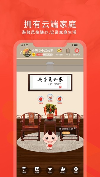 2、家庭空间:提供多种主题的虚拟家居模板,用户可自由装扮数字家园。完整记录家庭成员的重要时刻,智能生成纪念相册和成长影集。独创家庭互动红包功能,让亲人间的日常问候充满惊喜与温情。