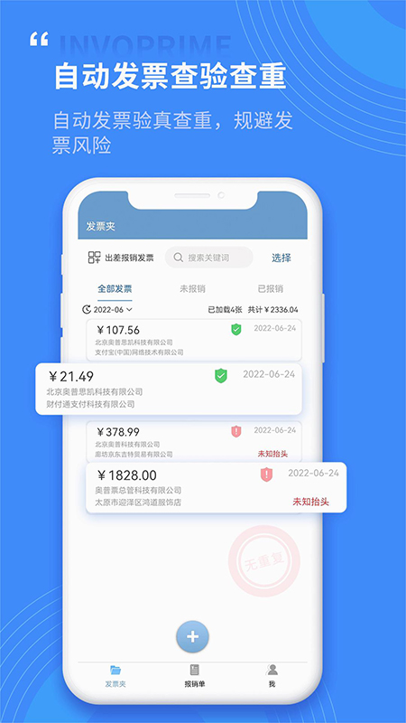 2、自动发票查验与查重:系统对接权威发票查验接口,可一键完成发票验真和查重操作,确保发票真实有效。
