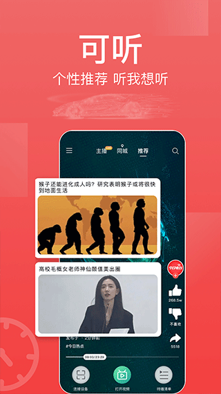 2、视频丰富多彩,视频的内容是比较丰富的,客户随时随地都能够刷出精彩纷呈的视频。视频板块采用智能瀑布流展示,支持根据网络环境自动调节画质。新增"即刻"短视频频道,聚合全网热点资讯,15秒带您快速了解天下事。专业的内容审核团队7×24小时值守,确保每个视频都符合优质标准,为您打造绿色健康的观看环境。