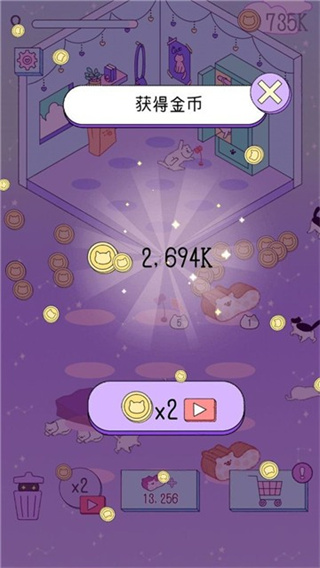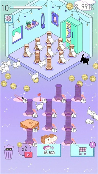 3、一直不断地升级猫咪的等级,还能增加猫咪们带来的收益,屋子也慢慢地被装饰,非常的有成就感。每只猫咪都可以通过互动提升亲密度,解锁特殊技能。高等级的猫咪会带来更多游戏币和稀有道具,帮助玩家更快地扩建和装饰自己的猫咪乐园。