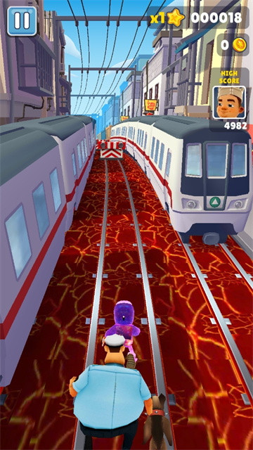 1、主页面,开始游戏。进入游戏后可以选择角色和道具,岩浆版本新增了防火服等特殊装备。2、遇到拦截的障碍物,向上滑跳过障碍物。岩浆版本中障碍物会喷发火焰,需要把握最佳跳跃时机。3、遇到较高的拦截障碍物,向下滑躲避障碍物。部分障碍物会持续燃烧,需要快速通过危险区域。4、遇到挡路的火车,向左或者向右,换到别的车道,躲避火车。岩浆版本中火车会喷出火星,增加了躲避难度。5、通过双击屏幕来启动滑板,滑板会持续一段时间。岩浆版本滑板具有防火功能,可以在熔岩上短暂滑行。6、获得弹簧后,在道具有效时间内,可以弹跳到房顶。岩浆版本新增了火山喷发助推效果,可以跳得更高更远。