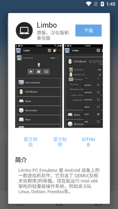 1、下载安装易卓虚拟机助手app,进入,找到首页点的三款虚拟机,任意选择点击获取。首次使用时建议仔细阅读每个虚拟机的特性说明,bochs适合运行x86架构系统,limbo以性能见长,apq则具有更好的兼容性,用户可根据实际需求选择最适合的平台。