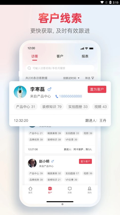 3、【客户追踪系统】实时记录客户浏览时长、收藏偏好等20余项行为数据,智能生成意向评分,销售跟进效率提升60%