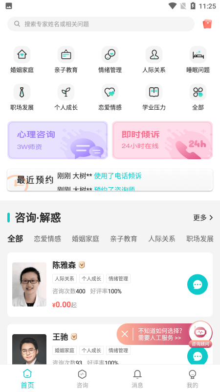 1、不同类型的话题分支研究心理咨询师,从婚姻情感以及亲子关系和日常生活压力到个人成长进步,对应的内容来咨询问题,可以更好的解答。平台设有20多个专业咨询方向,每个方向都有对应的专家团队,确保专业对口。