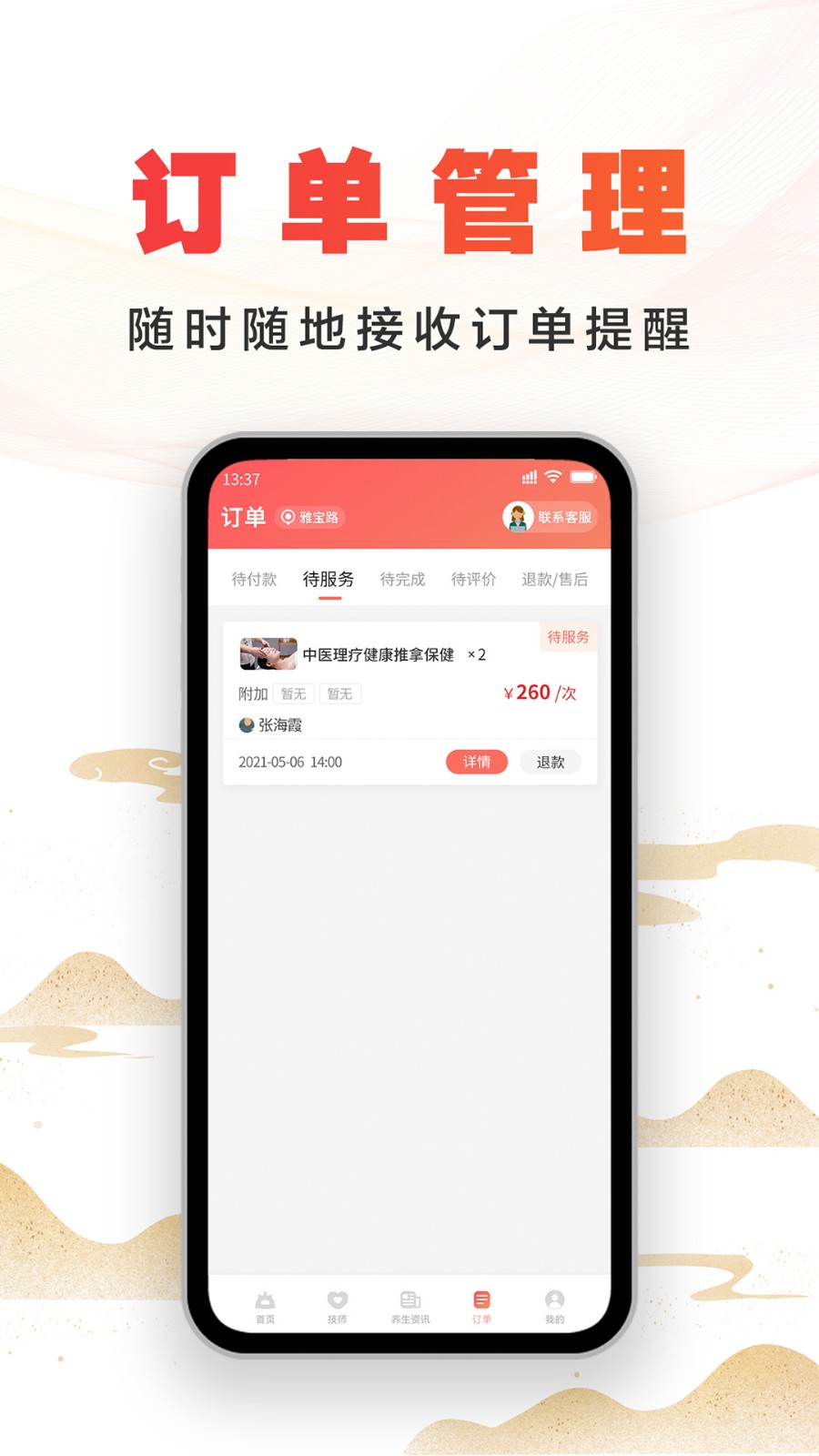 3、订单全生命周期管理,从预约确认、服务准备、进行中到完成评价,每个环节都有状态提示和操作指引,确保服务流程标准化。