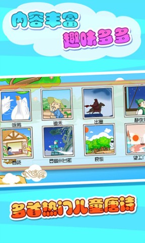 6、知晓唐诗中经典的语句,孩子们会惊喜地很快能流畅诵读。重点诗句会以特殊效果突出显示,配合互动游戏强化记忆。