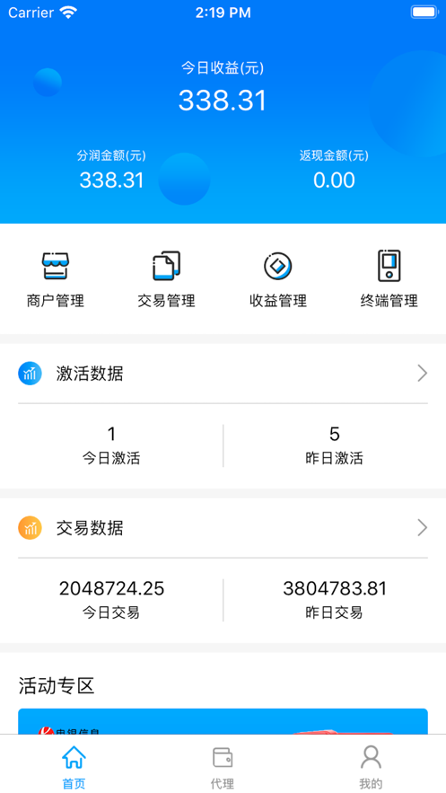 1、收益明细:可视化图表展示日/月收益趋势,支持按商户、终端等多维度筛选,自动生成电子对账单供下载留存。新增收益异常预警功能,当账目波动超过阈值时实时推送提醒。