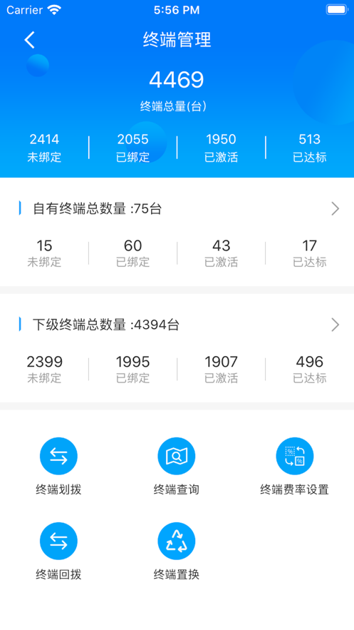 3、终端管理:搭载物联网技术,可远程监控终端状态(电量、网络、交易量),支持批量划拨设备到下级渠道。新增设备定位功能,防止终端异常移动。