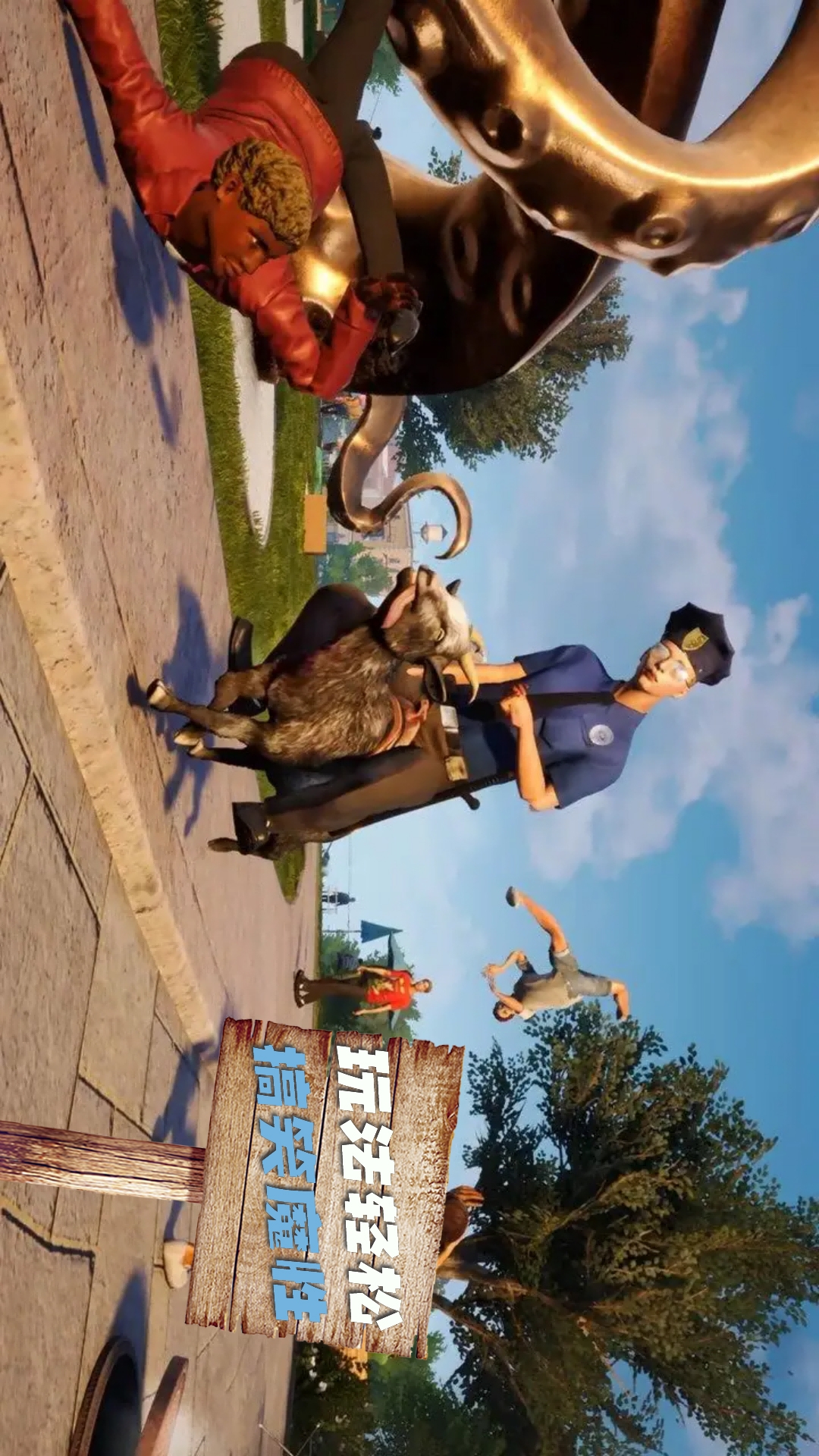 游戏最大的特色就是各种脑洞大开的互动玩法。你可以用山羊的舌头黏住任何物体,甚至能把路人拖来拖去;用角撞击物品会引发连锁反应,制造出令人捧腹的混乱场面。游戏还设置了大量特殊能力,比如喷射飞行、超级跳跃等,让恶作剧更加疯狂。与环境的互动充满惊喜,比如踢飞垃圾桶、撞翻货架等行为都会引发NPC的夸张反应。这些搞笑的互动设计让游戏充满了欢乐与挑战。