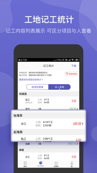 工地工资对账:创新性地整合了多种记工模式,无论是按天记工、按时记工还是加班记录,系统都能自动生成对账明细,支持工头与工人双向确认,有效避免工资纠纷;