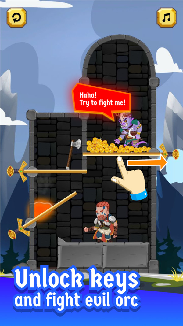 《救救维京国王》是一款极具创意的益智解谜游戏,采用独特的拉针玩法为核心机制。游戏以精美的卡通画风呈现北欧维京主题场景,玩家需要通过精准拔针来解救被困的维京国王。超过100个精心设计的关卡难度循序渐进,从简单到复杂逐步提升挑战性。游戏操作简单易上手但极具策略深度,每关都需要仔细观察场景布局,分析机关联动关系才能找到最佳解法。丰富多样的机关陷阱和物理效果让解谜过程充满变数,特别适合喜欢动脑思考的玩家体验。