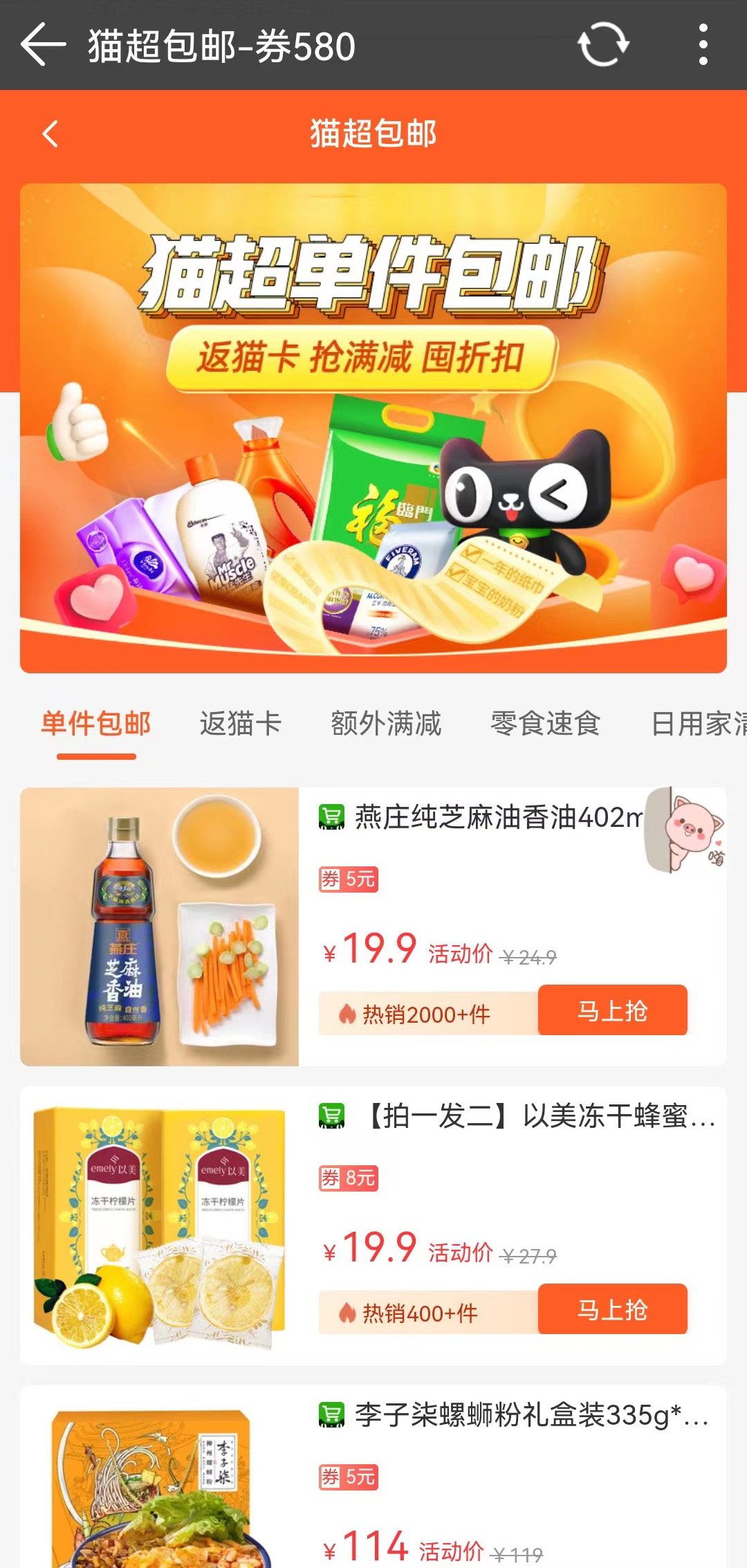 【猫超包邮】精选天猫超市单件包邮商品,让您无需凑单也能享受包邮优惠。