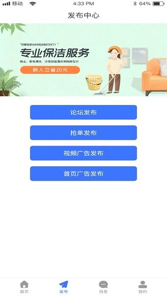 所有待付款,待发货,包括已经完成之后的订单都会保存记录,形成完整的消费轨迹便于追溯。根据个人需求选择,所覆盖的服务都是非常全面的,从家政保洁到设备维修应有尽有。为用户提供了非常便捷的服务,不管是想要预约保洁还是寻找其他服务都可以,操作流程简单直观。可以自己发表论坛,也可以去参与探讨其他人所发表的话题内容,打造活跃的社区交流空间。