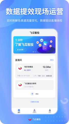 飞瓜智投是一款专为直播电商运营打造的智能管理工具,致力于为用户提供全方位的直播运营解决方案。该软件集数据监控、流量分析、主播管理于一体,通过直观的数据可视化和智能算法,帮助用户精准把握直播市场动态。无论是个人主播还是品牌商家,都能通过飞瓜智投轻松实现直播间流量增长、商品转化率提升等目标。其简洁明了的操作界面和强大的功能支持,让直播运营变得更加高效便捷,已成为众多电商从业者的得力助手。