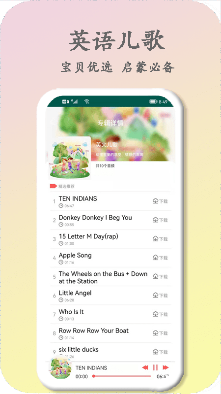 【英文儿歌乐园】收录大量经典英文儿歌,包括摇篮曲、动物儿歌、欧美童谣等,通过音乐形式培养英语语感,为英语学习打下良好基础。
