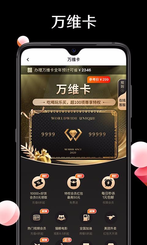 万维卡是一款专注于为用户提供全方位优惠卡服务的应用软件,致力于打造便捷高效的优惠消费体验。通过该平台,用户可以轻松申请专属优惠卡,享受覆盖生活各领域的特权福利。无论是淘宝、天猫等电商平台的购物折扣,还是美团外卖、腾讯视频等生活娱乐服务的会员优惠,都能在这里一站式获取。应用界面设计简洁直观,首页位于功能栏中央,展示各类精选商品推送,从时尚服饰到潮流箱包,用户可快速浏览并选购心仪商品。平台还整合了众多知名品牌的独家优惠,让用户在日常消费中享受更多实惠。