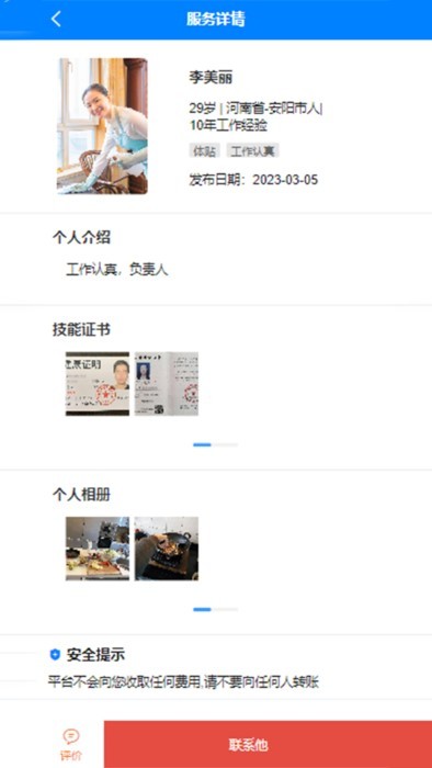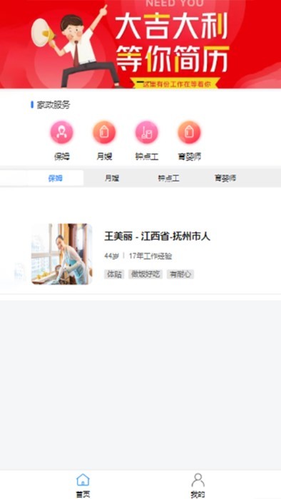 为我们提供了不同种类的家政人员,可以让用户自由的选择。每位服务人员都有详细资料和用户评价供参考。
