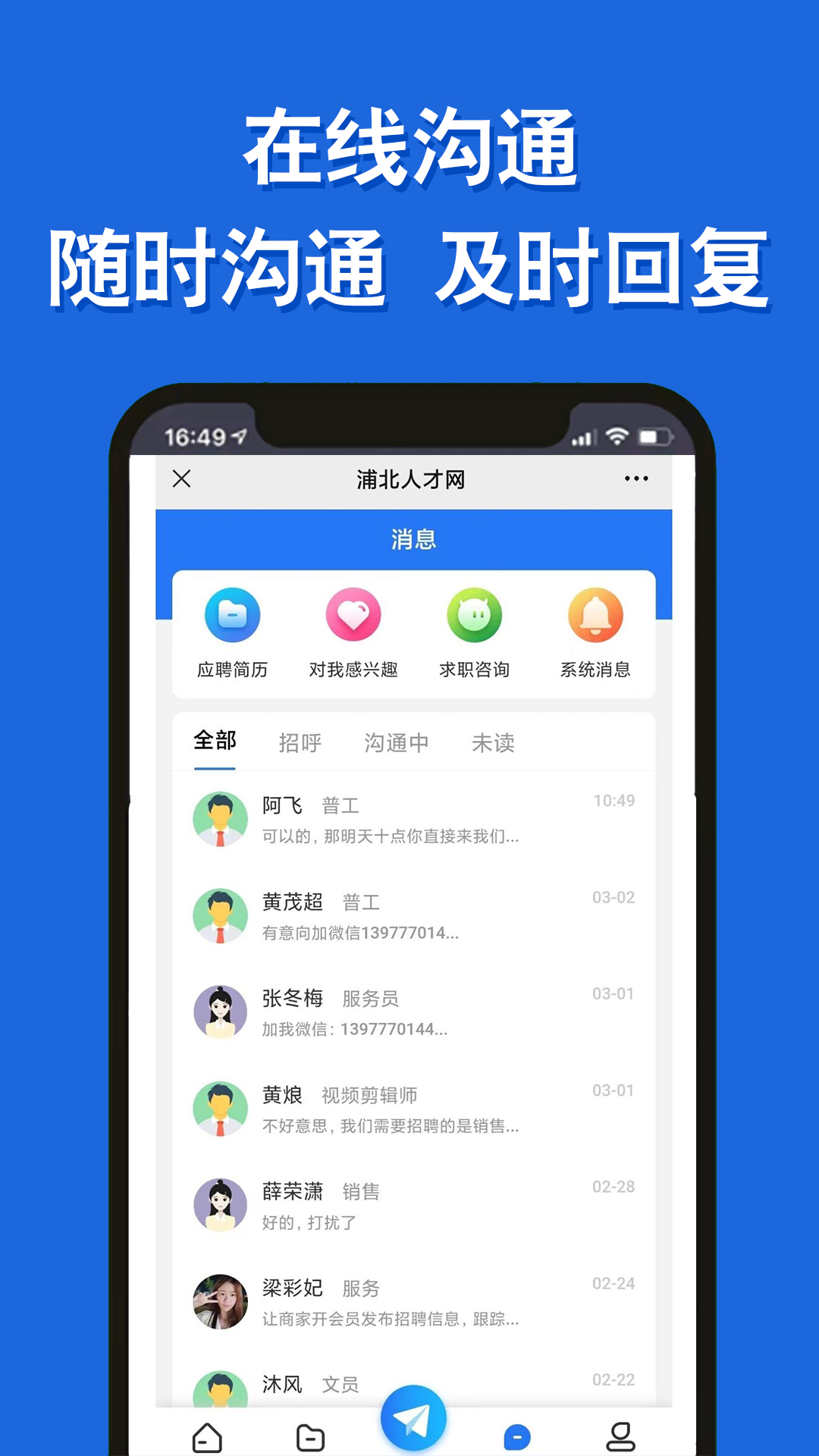 随时沟通及时回复,支持文字、语音、视频等多种沟通方式,让求职者与企业HR实现无缝对接。沟通记录自动保存,方便随时查阅重要信息。