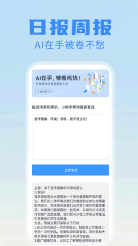 日报周报生成器手机版是一款专为职场人士打造的高效工作汇报工具,旨在帮助用户轻松完成日常和周度工作汇报任务。这款应用凭借其智能化、便捷化的特点,已经成为众多职场人士提升工作效率的得力助手。无论您是企业管理者、项目负责人,还是普通员工,都能通过这款应用快速生成专业规范的工作报告,让汇报工作变得简单高效。