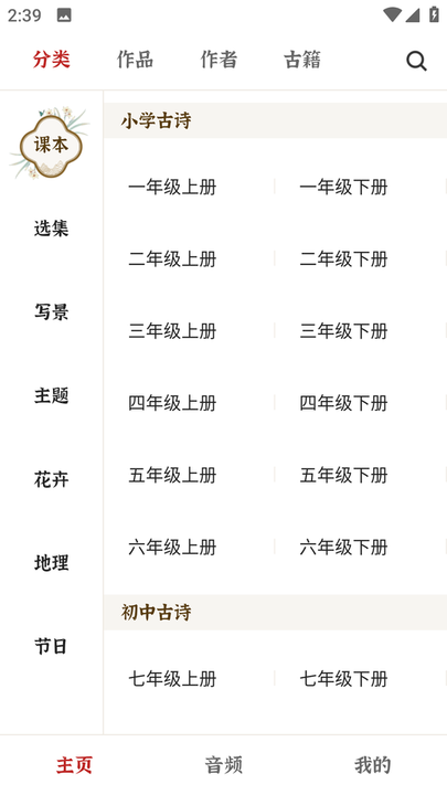 软件对收录的100万首诗词进行了科学细致的分类整理,包括按选集、主题、写景、节日、节气等常规分类,还特别设置了适合不同学段的学习分类,如小学、初中、高中等,方便用户根据自身需求快速找到合适的学习内容。此外还有按词牌、时令、用典、地理等特色分类,满足不同用户的学习需求。