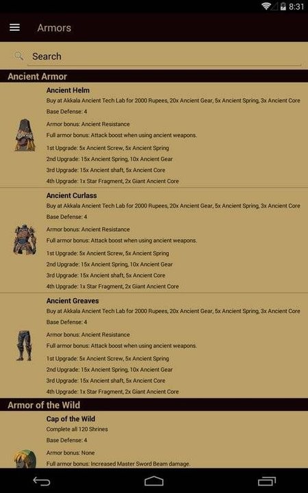 武器数据库:收录包括普通武器、弓箭、盾牌在内的所有装备数据(含amiibo专属装备),精确标注攻击力、耐久度等参数,以及可能出现的附加属性。