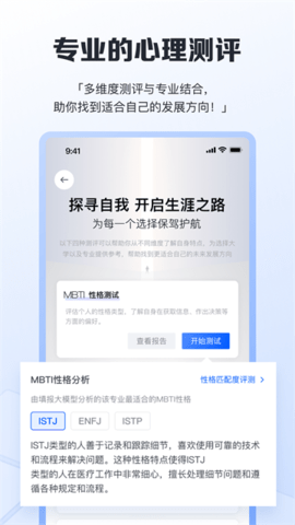 职业测评采用国际权威量表,通过科学的评估体系分析用户的职业倾向和发展潜力。测评报告包含详细的职业匹配度和能力分析,为用户提供可靠的职业规划参考依据。
