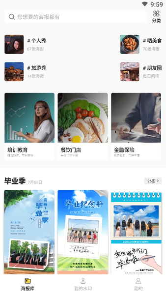 这款应用拥有海量精心设计的海报模板,覆盖商务推广、节日祝福、活动邀请、个人展示等各类场景。通过智能化的制作流程,您只需简单点击就能快速生成专业级海报作品。所有图片素材都支持自由编辑,包括尺寸调整、滤镜应用、文字排版等功能。无论是制作企业宣传海报、设计精美请柬、创作个性贺卡,还是策划社交媒体推广内容,水印海报app都能为您提供一站式解决方案。