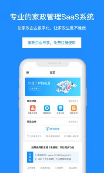 勤店通作为专业的家政管理SaaS系统,提供从店铺管理到订单处理的全流程解决方案。系统支持家政员信息管理、客户需求匹配、电子合同签订等核心功能,同时还提供家政行业专属的保险服务和证书报考通道。平台操作界面简洁直观,即使是初次使用的用户也能快速上手。基于十年的家政行业经验和互联网技术积累,勤店通持续优化产品体验,为家政企业数字化转型提供强有力的支持。