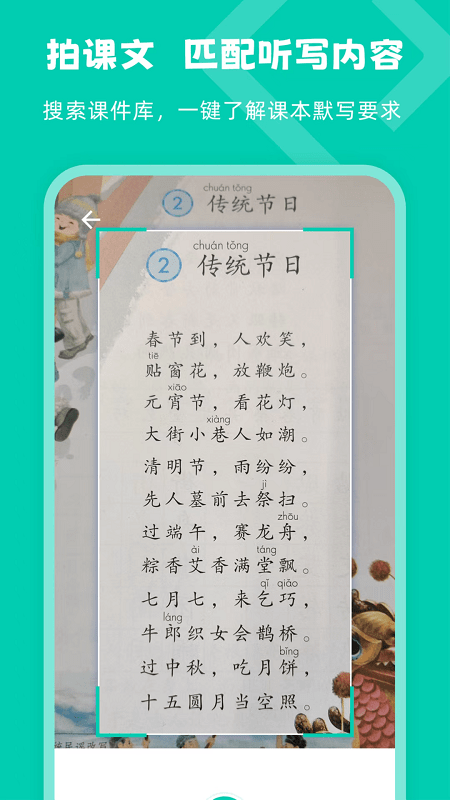 拍课文,匹配听写内容,搜索课件库,一键了解课本默写要求。智能识别系统可以准确抓取课本中的重点词汇,并按照教学大纲要求生成对应的听写内容。