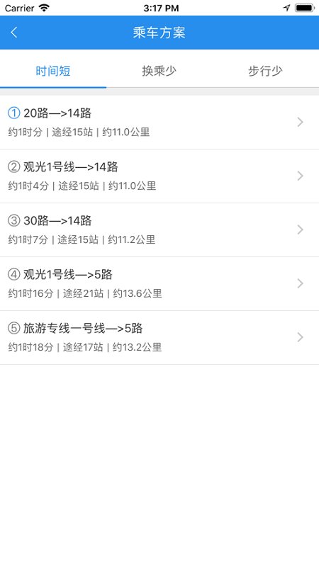 多种换乘方案:创新性地提供时间优先、换乘最少、步行最少、路程最短四种智能排序方案,并实时更新换乘车辆信息,让出行选择更加灵活多样;