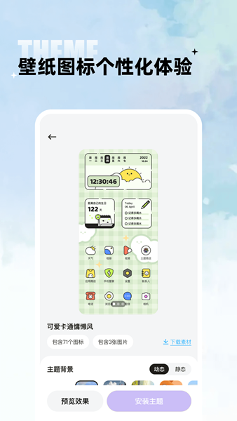 每周更新精品主题库,涵盖节日限定、季节限定等特色分类。主题效果可实时预览,一键切换无延迟,让您的手机桌面常换常新。