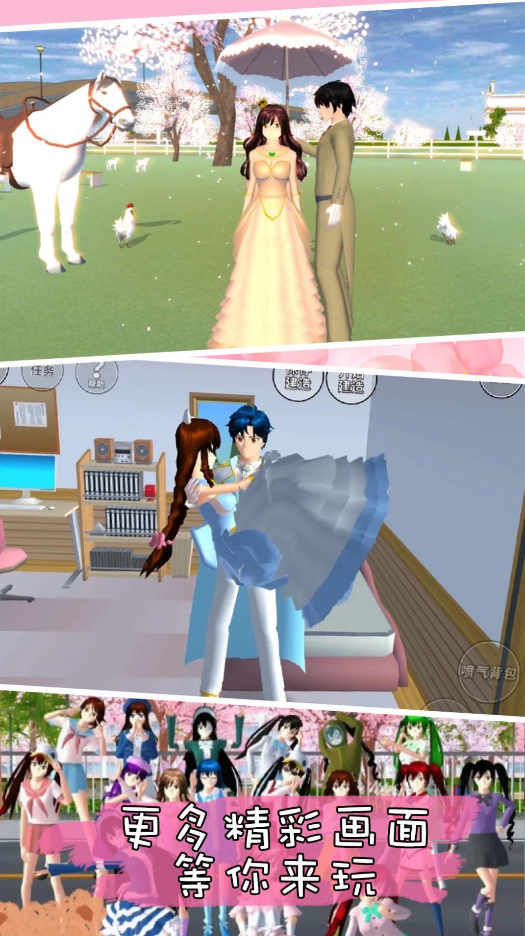 丰富的校园生活场景,包括学校、家庭和街区等,体验不同的生活场景;游戏精心设计了教学楼、图书馆、体育馆、天台等多个校园场景,每个区域都有独特的互动元素和随机事件。易懂的游戏操作和画风清新的卡通风格,非常适合各种年龄段的玩家;简洁直观的UI设计和贴心的新手引导,让玩家能快速上手享受游戏乐趣。有多种任务和成就可以解锁,在游戏中有成就感和挑战感;从日常作业到特殊活动,上百个精心设计的任务系统让游戏过程充满目标感和成就感。
