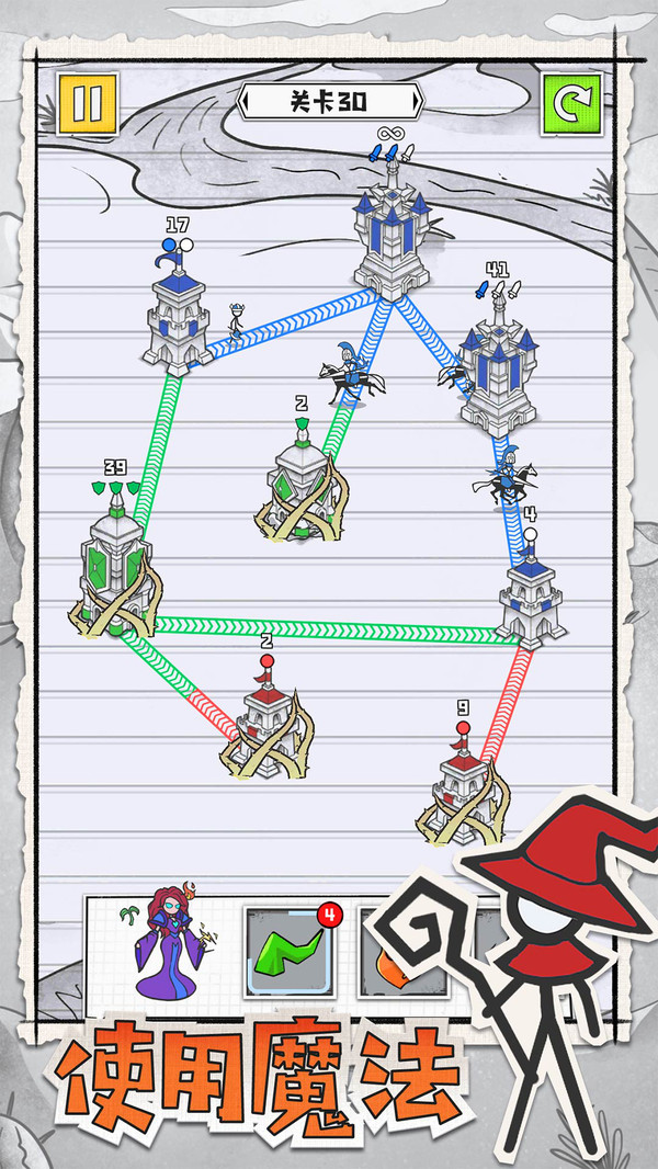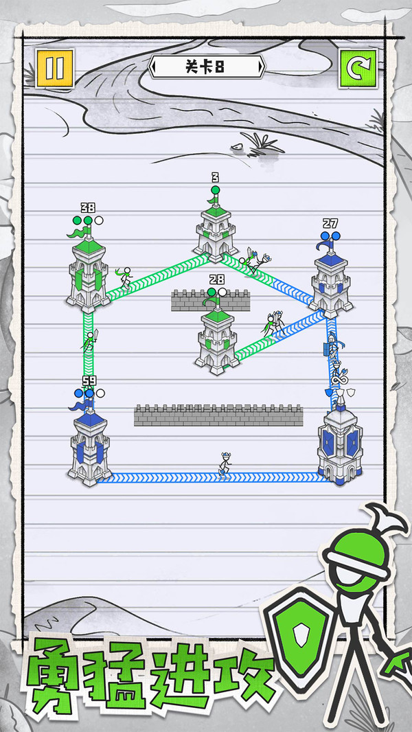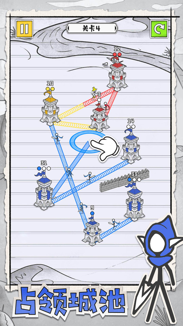 简单拖动:在你的城堡和其他城堡之间建立连接,指挥火柴人部队发起进攻。滑动断开:通过滑动来断开连接,灵活调整战略部署。不同阵营:每种颜色代表不同的城堡阵营,消灭其他阵营获得胜利,考验玩家的全局观。胜利目标:占领所有承包获得胜利,需要玩家合理分配兵力。城堡:积攒到足够分数会进化,能同时发出更多兵线,占领速度更快,让战斗更具策略性。进化高级:当城堡到达高分时,会将接收的火柴人士兵派发出去,形成强大的进攻力量。