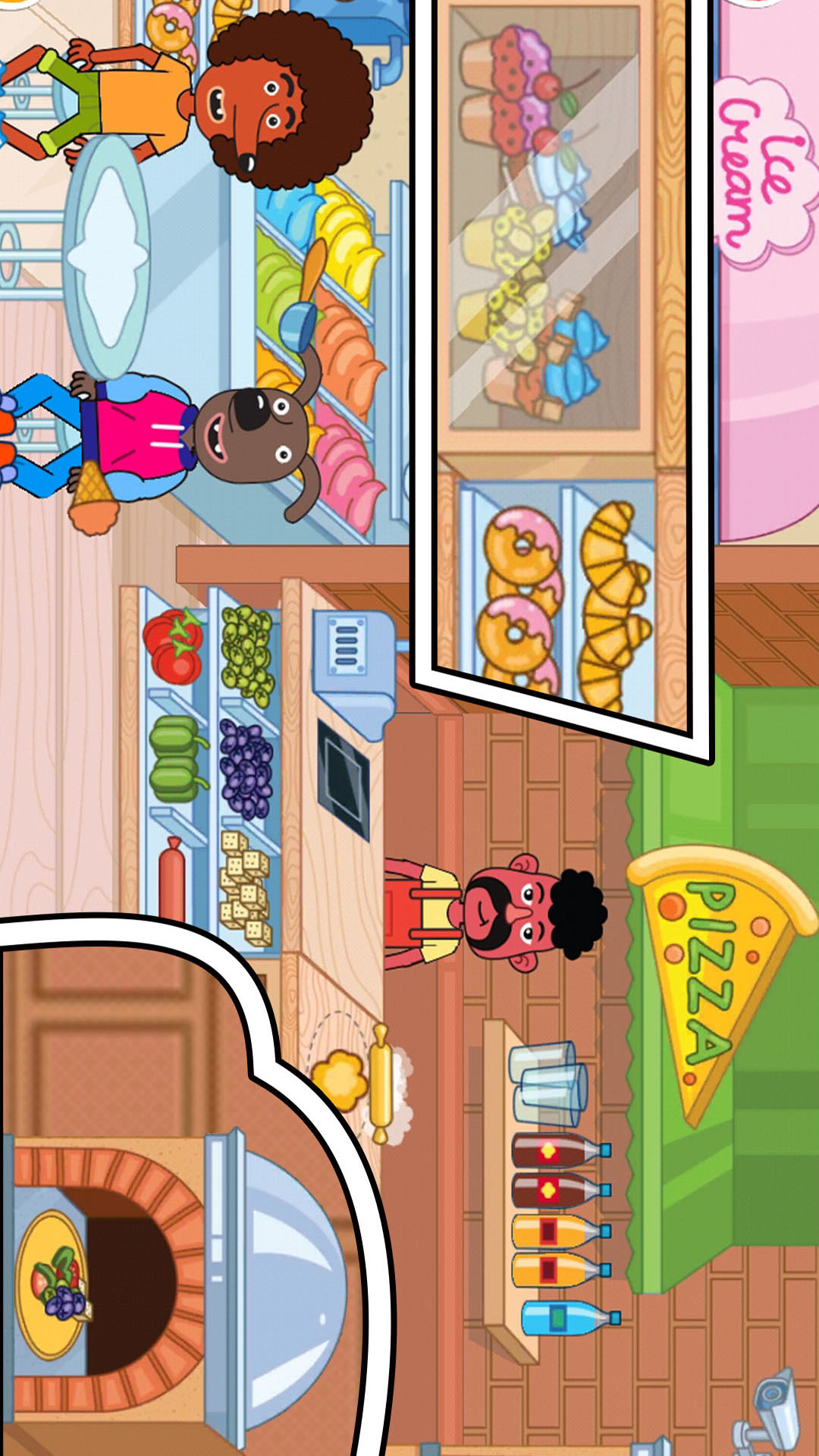 -超市购物:琳琅满目的商品包括薯条、冰淇淋、蛋糕、牛奶等各种食物,让孩子们体验真实的购物乐趣。