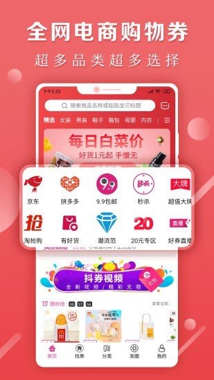 【极致省钱】独家优惠券库每日更新,让您每次购物都比别人更划算。【全场包邮】所有商品均享受免邮服务,再也不用为凑单发愁。【精选好货】专业买手团队24小时筛选优质商品,确保每一件都物超所值。【品类齐全】从日用品到奢侈品应有尽有,满足不同消费需求。【智能推荐】基于大数据分析,为您精准推送可能感兴趣的商品和优惠。