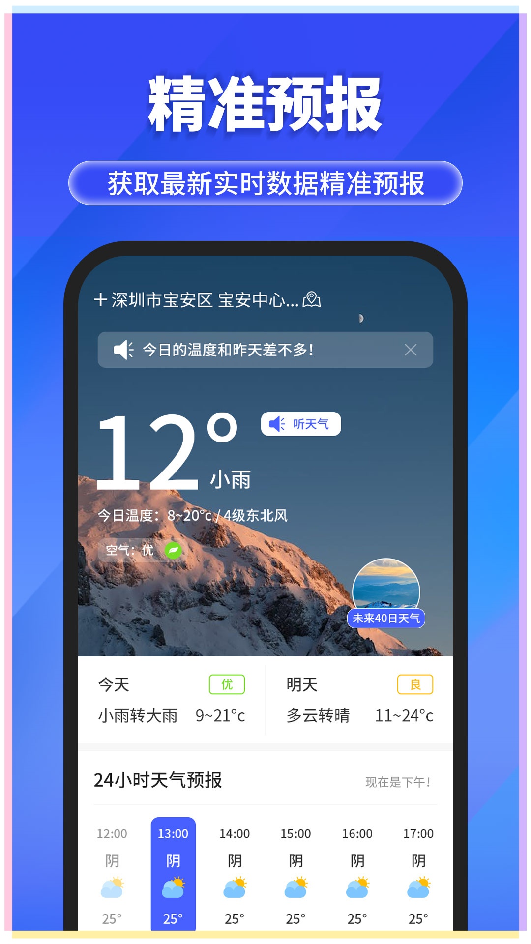 【定位设置】首次使用时,建议开启精准定位功能,这样应用就能自动获取您所在位置的实时天气信息,无需手动输入城市名称。