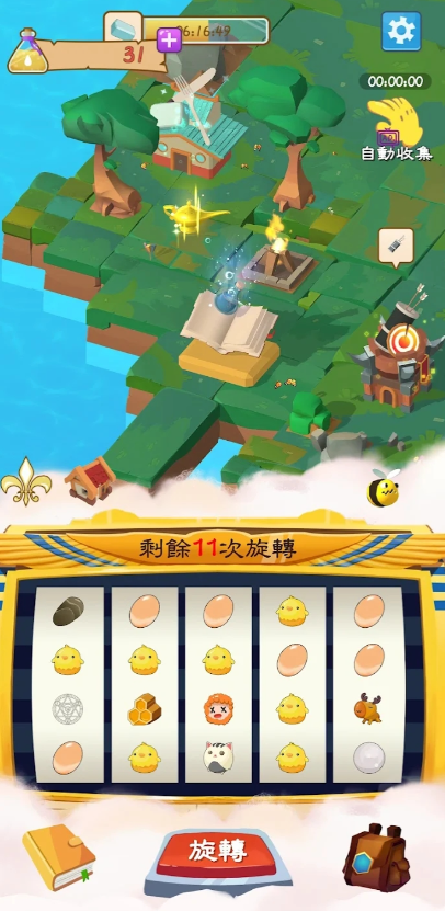 游戏开始时,玩家将获得老虎机的旋转机会,点击屏幕即可启动旋转。每次旋转都可能获得增益符文、原石等珍贵物品,这些物品将存放在你的背包中。通过合理使用这些资源,你可以升级宠物伙伴,增强它们的战斗能力。同时还要注意收集木材、石材等基础材料,用于建造各种设施。随着探索范围的扩大,你会发现更多隐藏的宝藏和神秘区域,逐步解锁整个岛屿的地图。