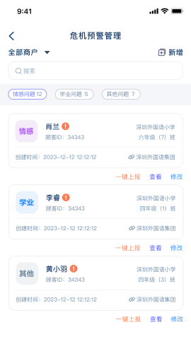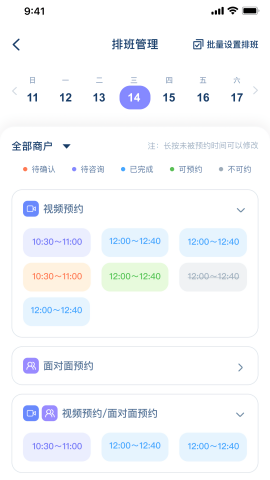 为心理医师及咨询师提供灵活的排班支持,在线即可高效处理预约服务;随时随地查阅预约者详细信息,快速掌握用户需求,提升服务质量;独特的危机预警机制,面临紧急情况时,一键即可上报,确保快速响应。此外,应用还提供专业的数据备份功能,防止重要信息丢失,为咨询工作提供双重保障。