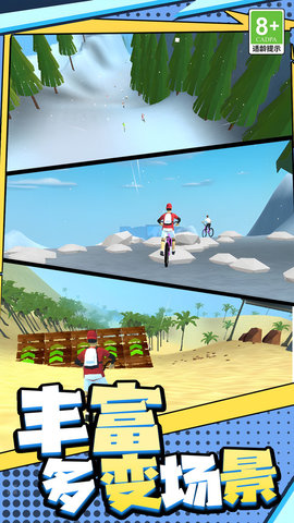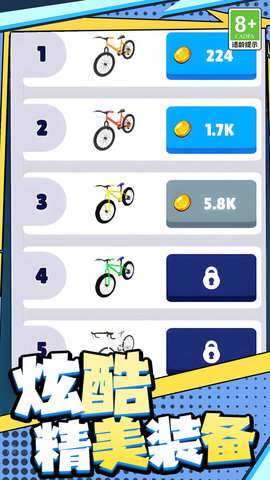 2、车辆任选超自由:不管是轻便敏捷的公路车,还是能适应各种路况的山地车,统统不用解锁,开场就能跨上心仪座驾,按自己战术去冲,爽歪歪,完全不用担心付费墙的限制。