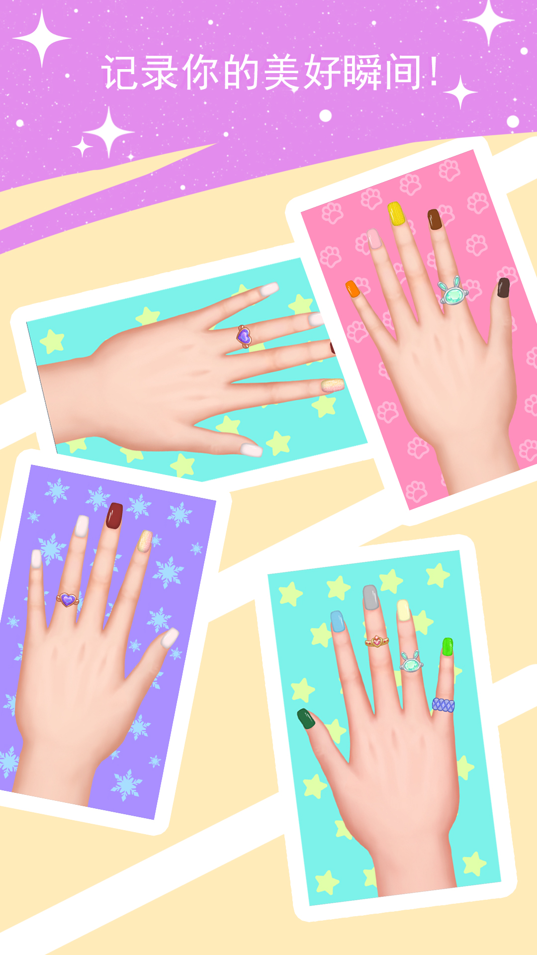 游戏提供了数百种美甲款式,从简约的单色到复杂的艺术图案应有尽有。玩家可以选择不同的指甲形状、底色和装饰,如亮片、贴纸和立体饰品,打造个性化的美甲作品。每种设计都经过精心制作,细节丰富,让玩家的指尖焕发光彩。此外,游戏还支持保存和分享功能,方便玩家展示自己的创意作品。