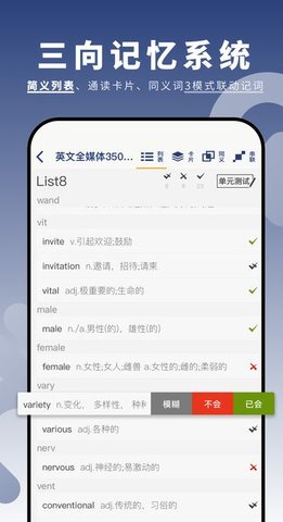 平台提供基于记忆科学的系统化攻略,包含词根词缀解析、联想记忆法等十余种技巧。每个单词都配有真人发音、例句场景和记忆口诀,帮助建立多重记忆联结。攻略内容按难度分级,从基础3000词到专业术语全覆盖。用户还可以收藏个性化记忆笔记,形成专属的词库攻略。