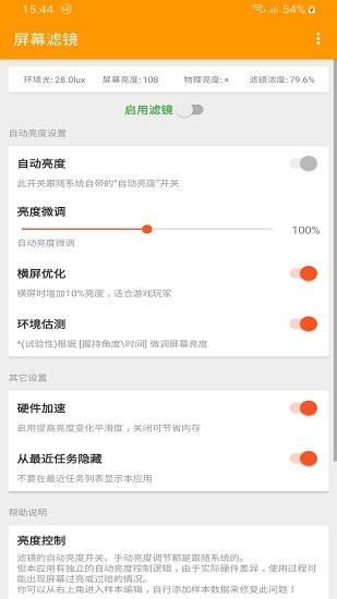 作为一款小巧实用的屏幕调节工具,它主要功能是为手机屏幕添加滤镜效果。在使用前需要开启相关权限,之后您可以对滤镜进行微调,还能根据环境光线调整色温,确保在任何光照条件下都能获得最佳的视觉体验。